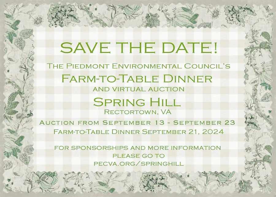 PEC’s annual Farm-to-Table Dinner will take place at historic Spring Hill, where Michela Gorham & Family will host us for cocktails, a farm-to-table dinner, and dancing to Gordon Sterling & The People — all with sweeping views of the Blue Ridge Mountains and PEC’s Piedmont Memorial Overlook.
