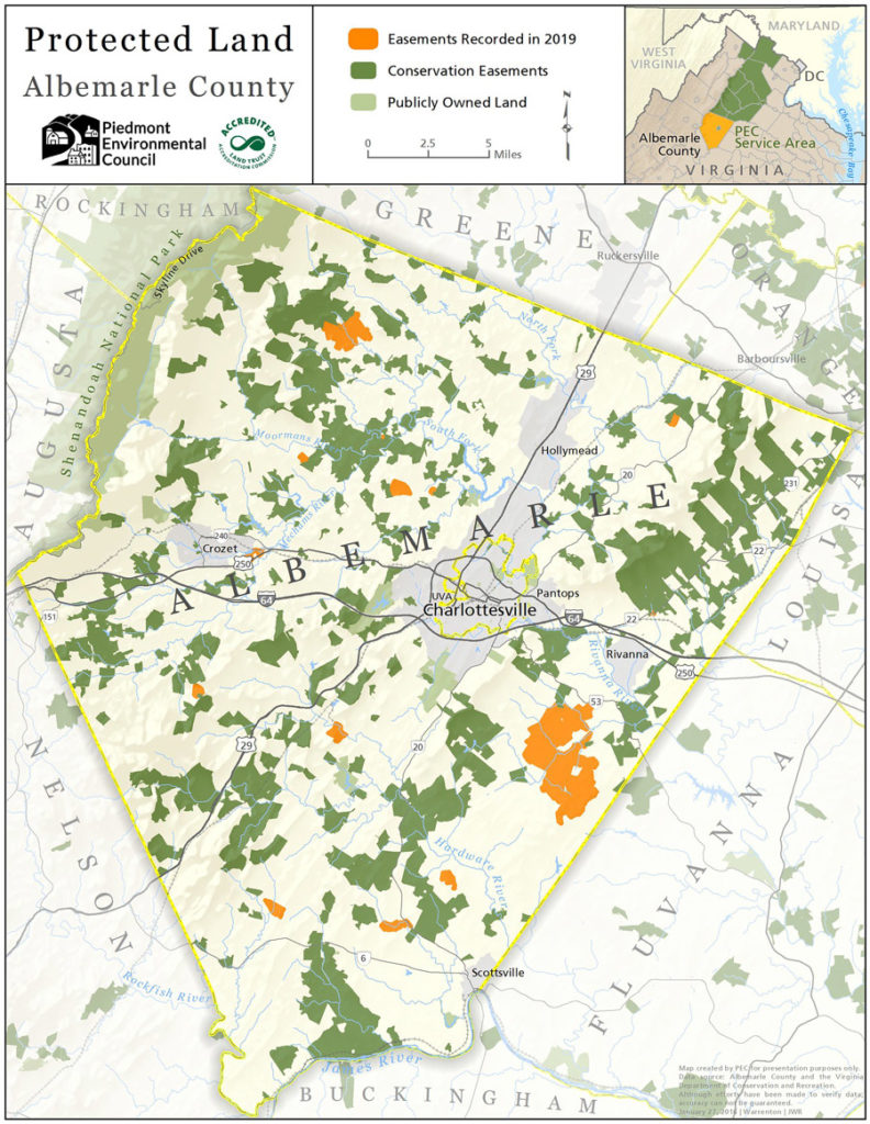 Persistence eventually paid off, and in early 2019, the landowner wanted to protect the land by donating a conservation easement. We connected the owner with the Albemarle Conservation Easement Authority, which actually holds the easement, and by July 2019, this important property was permanently protected. It is now one of the largest conserved properties in the region.