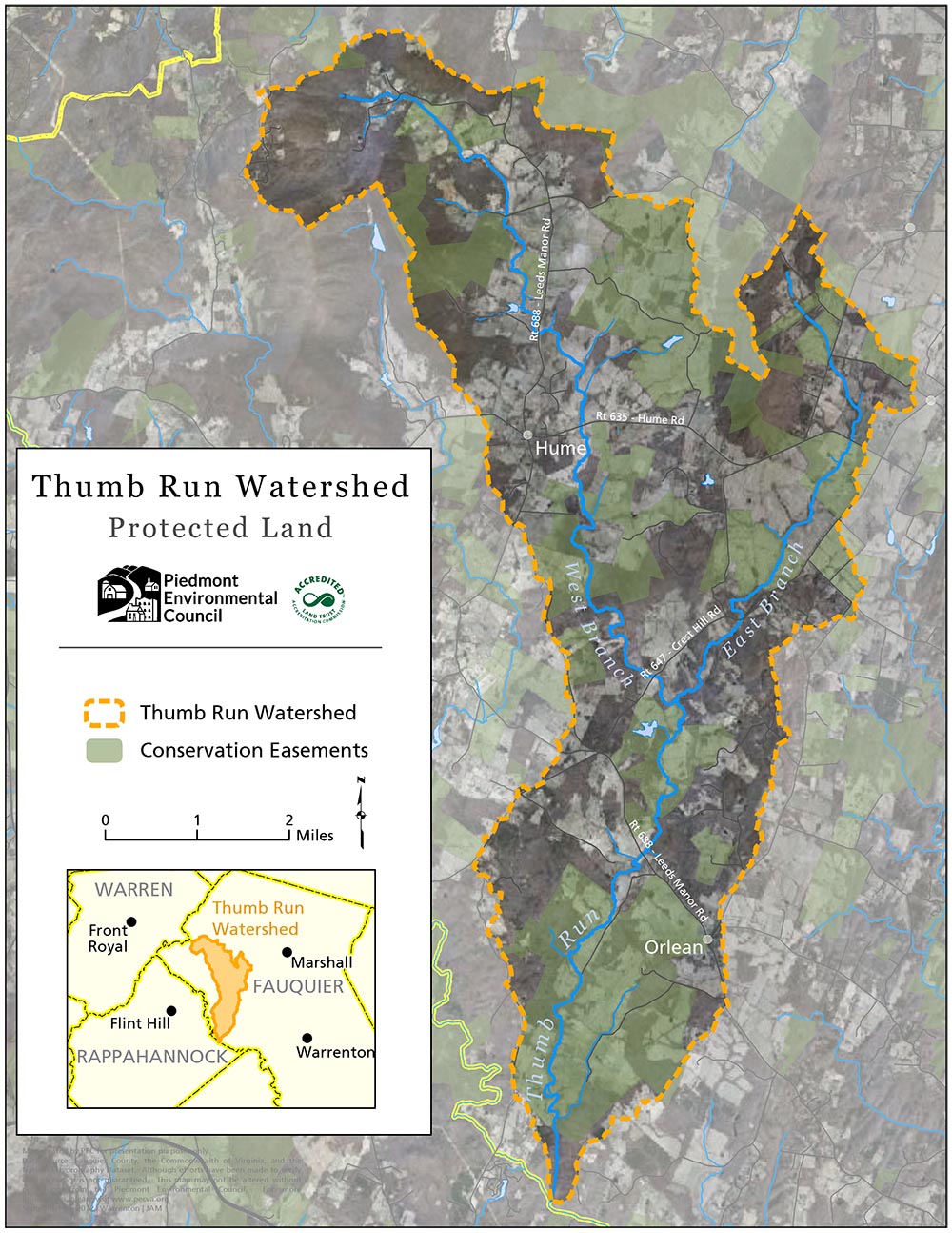 The Thumb Run Watershed Wildlife Corridor Project began in 2012 with a generous grant from The Volgenau Foundation, which remains committed to partnering with PEC and funding work in the watershed. Thumb Run is classified as an impaired waterway by the Department of Environmental Quality due to high levels of E. coli bacteria. The east and west branch of Thumb Run flow through Hume and parts of Marshall, before joining together near Orlean and emptying into the Rappahannock River near Amissville. Roughly 600 landowners call the Thumb Run watershed home.