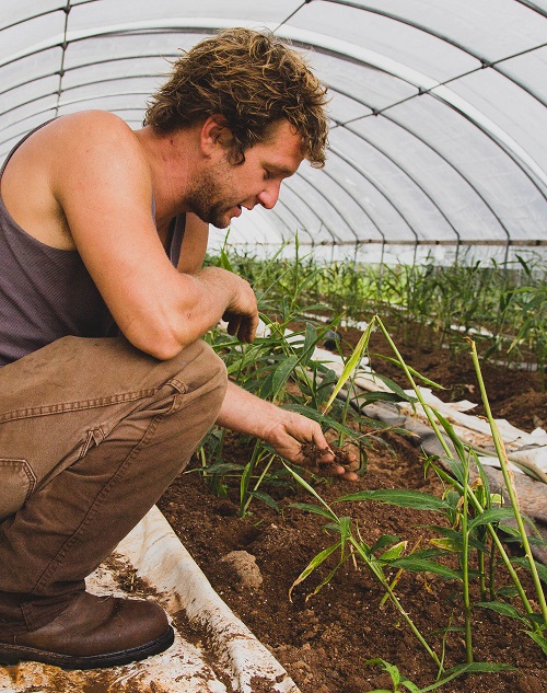 As rain begins to roll off the mountains and onto the farm one July afternoon, Walden ducks into a 3,000-square-foot greenhouse that’s growing neat rows of what looks like bamboo shoots. It’s ginger root, and lots of it.