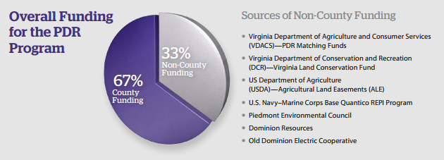 Fauquier’s Purchase of Development Rights program pays landowners of agricultural operations to limit the development potential of their land through a conservation easement. Unlike a donated conservation easement, the PDR program pays farmers a flat rate of $25,000 per development right they wish to extinguish.