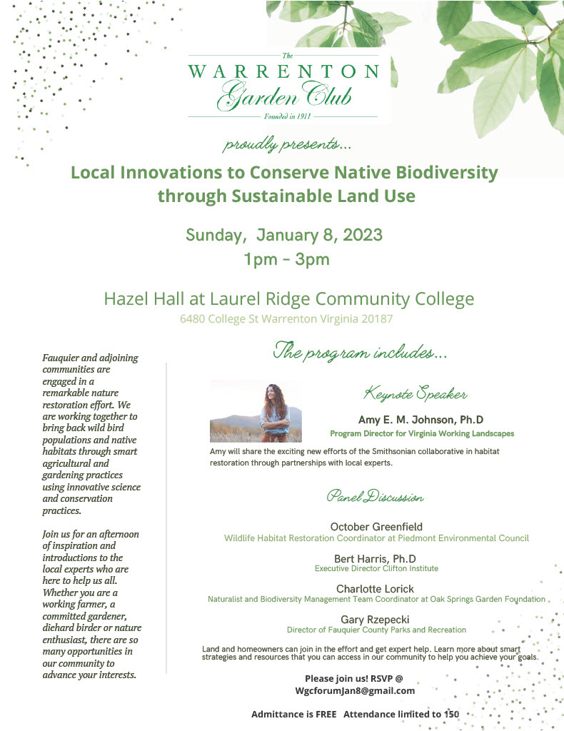 Join the Warrenton Garden Club for an afternoon of inspiration and introductions to the local experts working on biodiversity conservation. Whether you are a working farmer, a committed gardener, diehard birder or nature enthusiast, there are so many opportunities in our community to advance your interests.