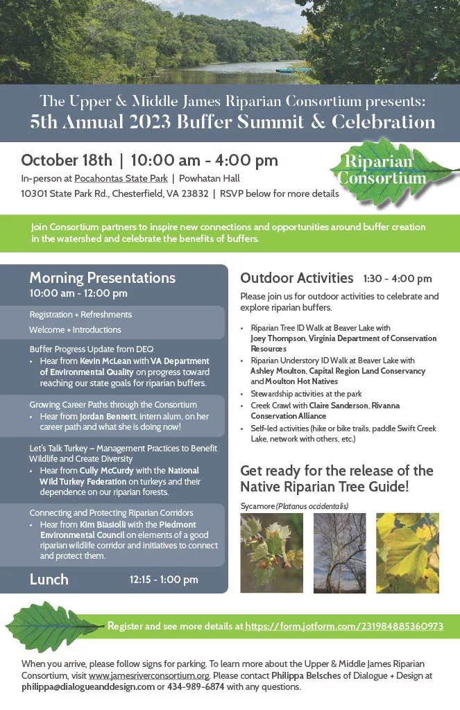Please save the date and join us for the fifth annual Buffer Summit and Celebration hosted by the Upper & Middle James Riparian Consortium! The Buffer Summit will be held in person on Wednesday, October 18, 2023, from 10 a.m. to 4 p.m.