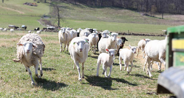 Sheep running behind a tractor |