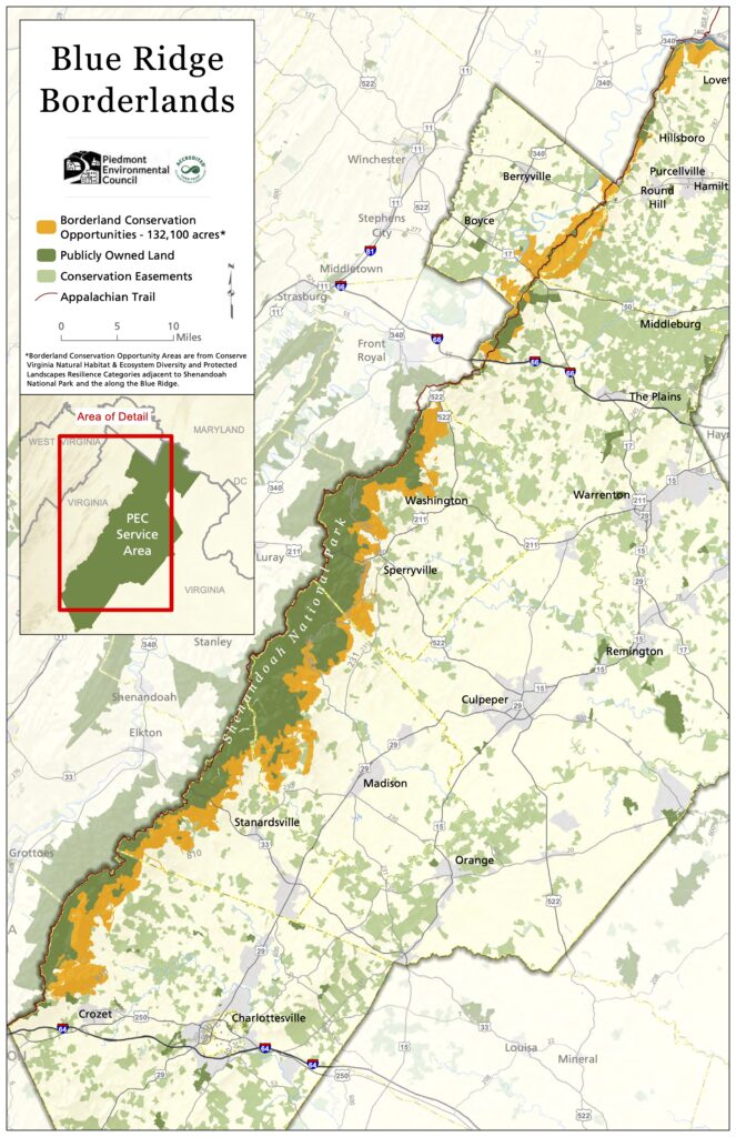 Because the public lands of Shenandoah National Park are very long and narrow, the adjacent privately owned lands play a major role, both as part of the greater Shenandoah ecosystem and as a buffer to the core of protected lands that make up the park. That’s why over the past few years, the Piedmont Environmental Council has been facilitating a large, landscape-scale conservation project to permanently protect these areas, which we call the Southern Shenandoah Borderlands.