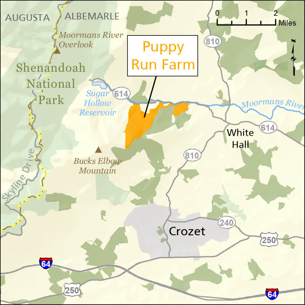 Puppy Run Farm’s 670 acres of undeveloped splendor can be seen from three miles away at the top of Buck’s Elbow, along the Appalachian Trail and the Moormans River Overlook on Skyline Drive. Hikers driving out to the Sugar Hollow Reservoir Trailhead can view the farm for miles along rural Sugar Hollow Road. The farm fronts more than 3,000 feet of the Moormans River, a designated Virginia Scenic River, which along with other tributaries on the farm—including Puppy Run and Porterfield Branch—supply drinking water for the City of Charlottesville and parts of Albemarle County.