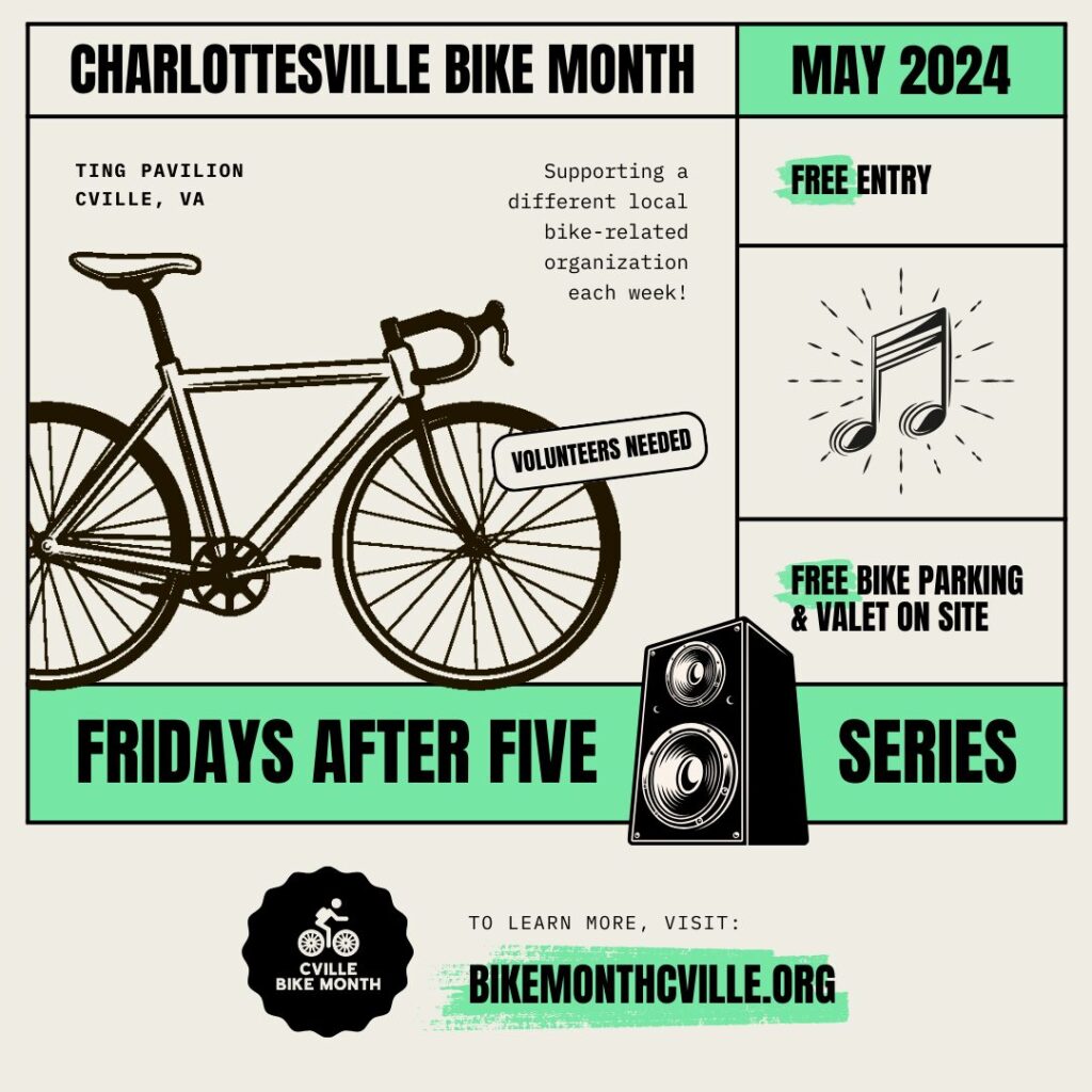 Ting Pavilion on the Downtown MallEach Friday during Bike Month, there will be a free bike valet service and a hangout tent for cyclists at the Ting Pavilion for Fridays After Five. This is Charlottesville’s weekly, free concert and community celebration on the Downtown Mall. Volunteers from a variety of bike-friendly nonprofits will pour drinks; their groups will receive a share of the proceeds.