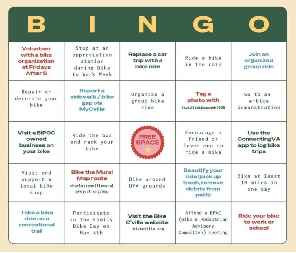 Forward this email to your friends and follow @BikeCville on Instagram and Facebook and share their posts. Use the hashtags #cvillebikemonth2025, #bikecville and #bikemonth.