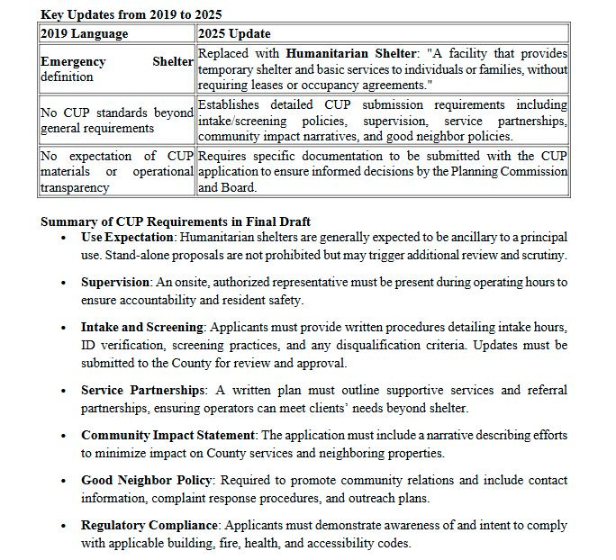 “Since 2019, the County has required a Conditional Use Permit (CUP) for emergency shelters, which were then defined as ‘a facility providing temporary housing for one or more individuals who are temporarily or permanently homeless,’” reads the staff report.