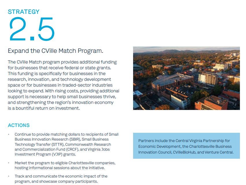 “The CVille Match program provides additional funding for businesses that receive federal or state grants,” reads more details in the EDSP. “This funding is specifically for businesses in the research, innovation, and technology development space or for businesses in traded-sector industries looking to expand.”