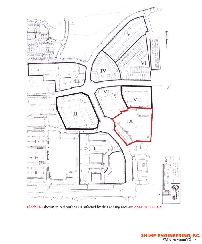 Shimp Engineering has filed documents to amend the Code of Development to make several changes. The property owner seeks to allow the maximum number of units within Area C from 370 to 410 and make various other adjustments.