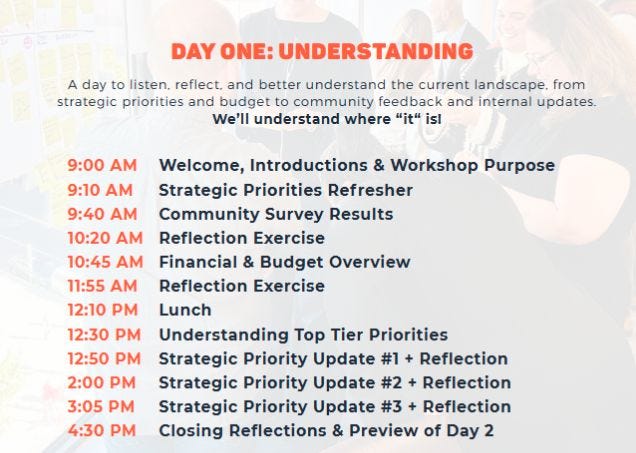 All of the work is in service of creating a new strategic plan to guide the work of local government. That’s a different document than a Comprehensive Plan, which sets an overall vision. The two are related, but developed and approved separately.