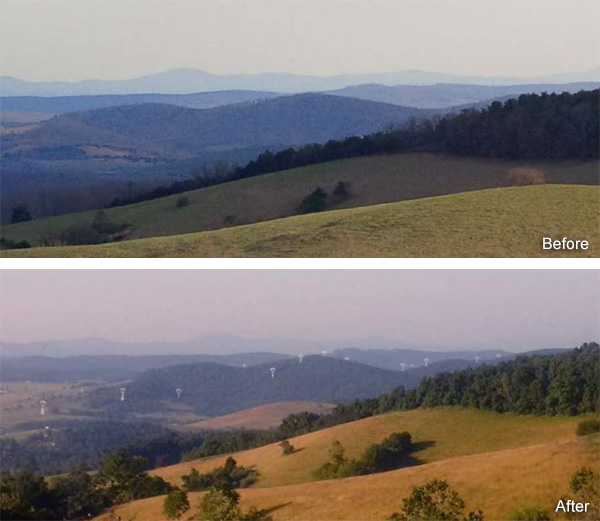 In PEC’s experience with other transmission lines, we have sometimes seen Dominion make adjustments to reduce the impact of its projects on private and public resources, but it requires people to speak out and speak up. In a similar case in Augusta County, it was only after galvanized steel towers were used to replace an existing line, that residents realized just how important design choices can be. See the before and after photos below.