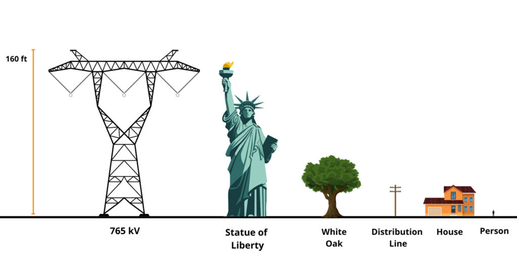A 765 kV line is the highest-voltage transmission line we have in the United States. They can move up to 3500 MW of power over long distances efficiently; about three times as much power over the same distance as the next-largest size, 500 kV. For context, 500 kV lines are currently the highest voltage Dominion Energy operates in Virginia. The tradeoff to moving all that power is size.