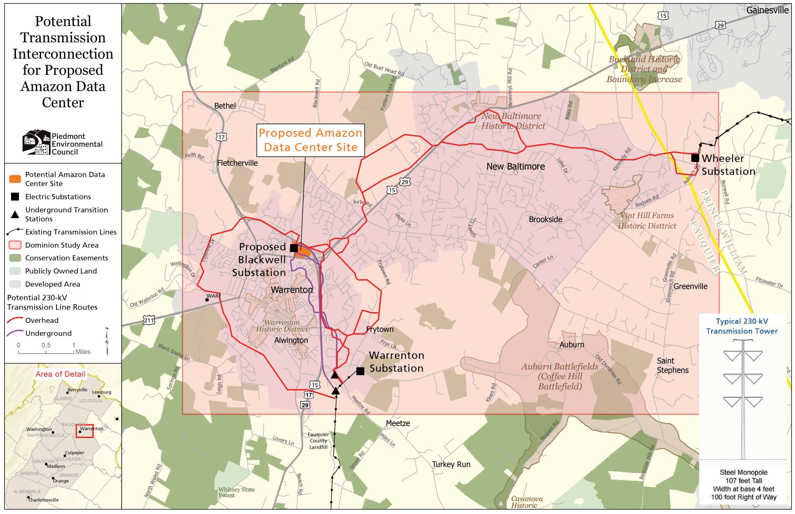 However, in late March consultants for Dominion Energy stopped by The Piedmont Environmental Council office in Warrenton to discuss a potential new transmission line project with us. They explained that in order to serve the proposed Amazon Data Center, Dominion expects to build a new substation at the Amazon site and then bring a new 230-kV transmission line into that substation.