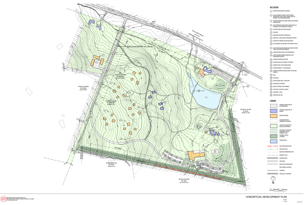 Blackthorne Inn is located in agricultural zoning along Rt 50 between Upperville and Paris. Until it was closed last year, Blackthorne operated as a restaurant and resort with a few small events. Since then, Easton Porter Group, LLC acquired the 50.66 acre property with the desire to renew and expand the restaurant, resort, and Class C event special exceptions. The proposal includes a new 19,000 sq ft event building, a 30% increase to the current restaurant, 20 new cabins for a total of 38 private units, 3 new support structures (3,000 sq ft), and a new spa with gym. The old event building, which was added to the restaurant without a permit, would be removed.