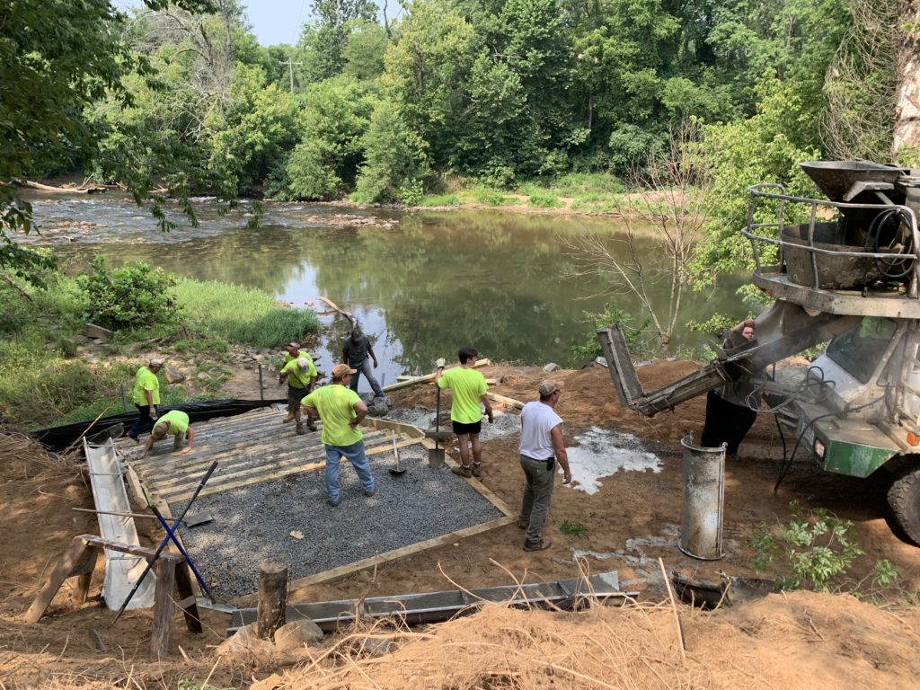 REMINGTON, VA. (August 5, 2021) – Fauquier County’s second Rappahannock River kayak/canoe launch is now open at the Rector Tract, located at the end of River Road in Remington, giving county residents a new public access point to the state-designated scenic river. The timber-framed, concrete staircase, with a wooden slide for hand-launch of non-motorized vessels, was built over five days last week by Brad Mawyer of the Virginia Department of Wildlife Resources, Wes Hale and a crew of staff from Fauquier County Parks and Recreation, Maggi Blomstrom of The Piedmont Environmental Council, and three Fauquier County resident volunteers. An official ribbon-cutting ceremony will be held Saturday, Aug. 14 at 12 p.m.