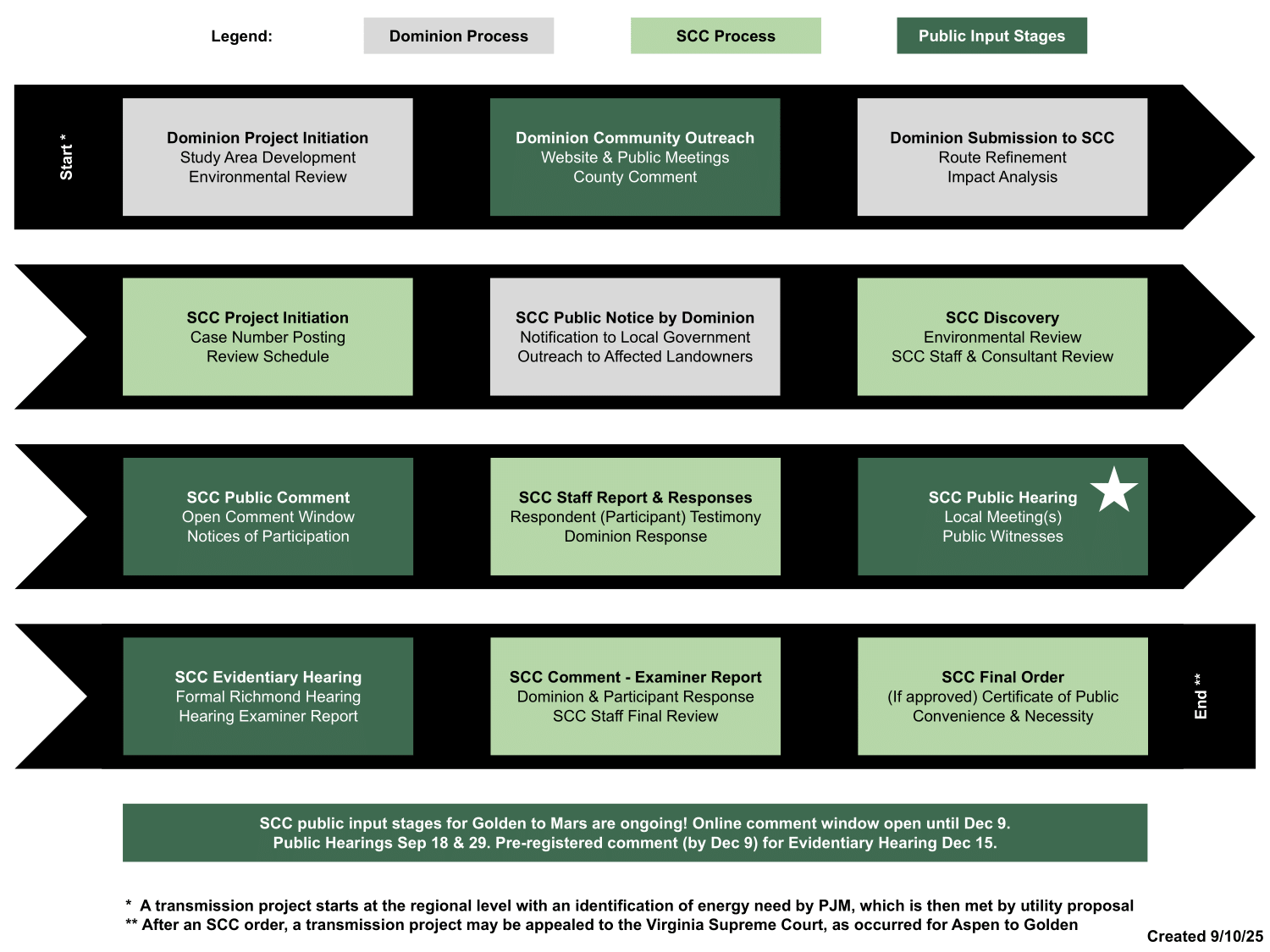 April 15, 2025: The Board of Supervisors directed the County to file as a participant in the SCC case, which provides them additional information and opportunity for comment as a “referral agency” (Loudoun Times Mirror). See graphic below, which shows the SCC process for vetting a proposed Dominion project.