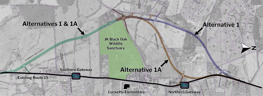 At a community meeting on Oct. 8, Loudoun County eliminated all Lucketts bypass options except Alternatives 1 and 1A (see map).