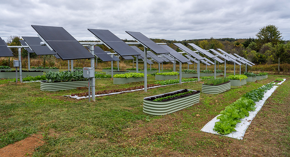 PEC has launched Virginia’s first crop-based agrivoltaics demonstration project at our Community Farm at Roundabout Meadows in Aldie! Agrivoltaics is the dual use of farm land to produce both food and energy from solar panels. Our quarter-acre installation features 42 solar panels with vegetable crops planted between them – in the ground and in raised beds (meant to illustrate applicability in urban or other impervious locations). We’re happy to report that the crops are growing and the solar panels are now fully operational, producing enough electricity to power all farm operations and charge backup batteries (which kept us operational even when the grid went down recently).