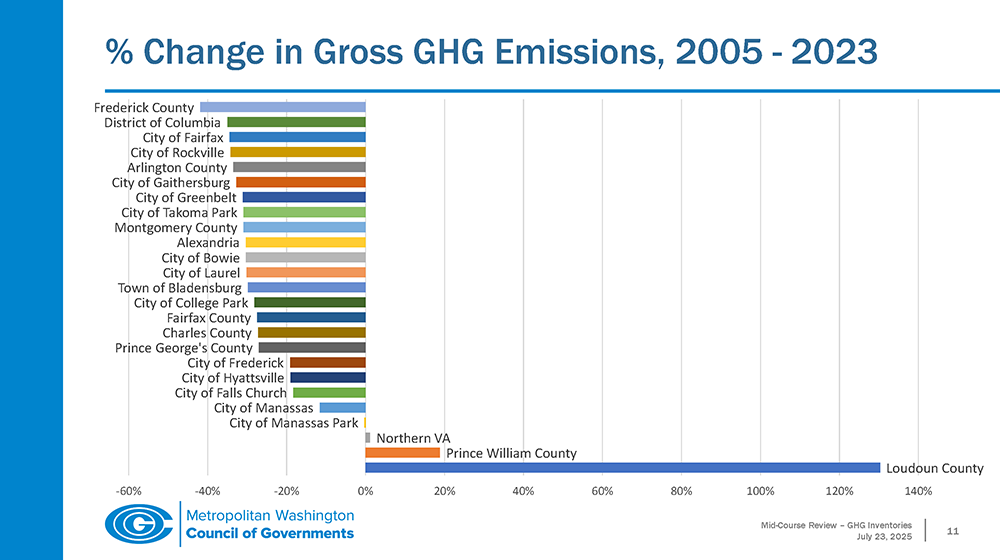 With the local energy grid under immense strain, PJM, our regional transmission organization, implemented pre-emergency management measures to request participating data centers run their generators on peak load days. From June 23-25, data centers in Loudoun ran their generators for upwards of seven hours a day. The Tier 2 generators used by most data centers spew high levels of particulates, with serious health impacts, particularly for sensitive populations. This also hinders regional climate goals. Data centers have significantly increased Loudoun’s greenhouse gas emissions (GHG), contrasting with progress in other jurisdictions.