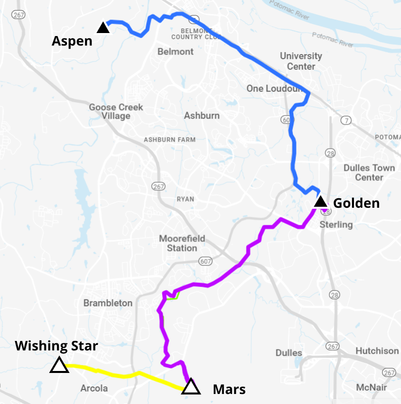 Click to expand: Map of Ashburn, Sterling and Brambleton areas in Loudoun County. Blue line: Aspen to Golden. Purple line: Golden to Mars. Green line: 3A route variation (next to purple line, to the right of “Brambleton”). Yellow line: Mars to Wishing Star.
