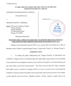 Orange County, VA. (Nov. 10, 2023) – In the interest of good governance and transparency, The Piedmont Environmental Council filed a lawsuit yesterday against Orange County for improperly denying public access to documents pertaining to a local rezoning application, in violation of the Virginia Freedom of Information Act. The lawsuit comes after Orange County officials were unresponsive to PEC’s petition for a Writ of Mandamus, served on Oct. 26, which gave county officials a number of days to correct their VFOIA deficiencies. The lawsuit reflects PEC’s growing concern about the dramatic loss of public access to information about land use decisions in Orange County and across the Commonwealth.