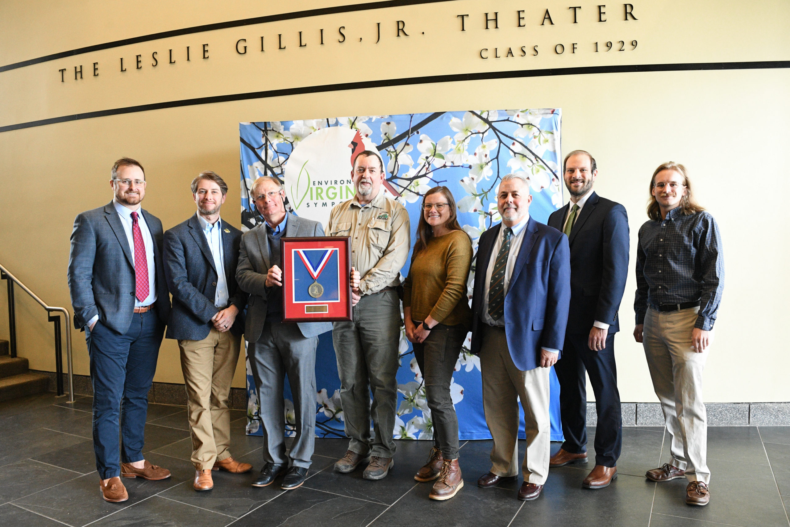 A group of eight people from numerous organizations and government agencies stand together. Two people in the center hold a framed medal award.