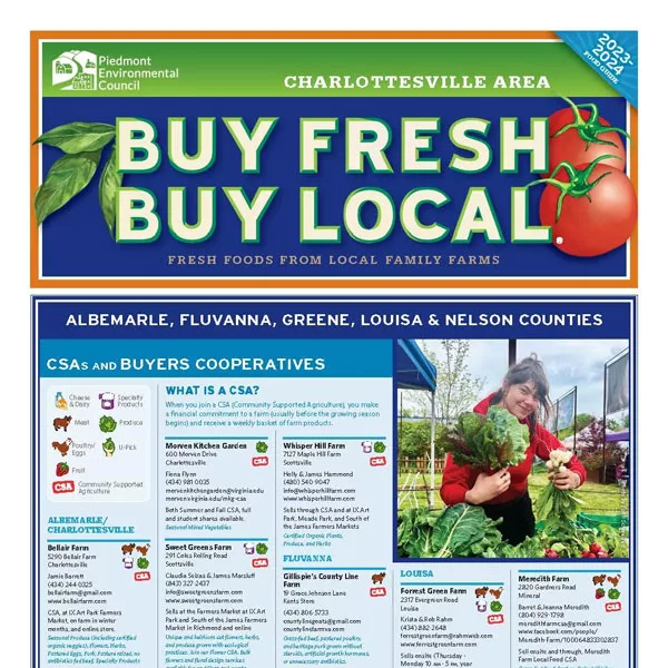 The Charlottesville Area guide features more than 200 local food producers and distributors in Albemarle, Fluvanna, Greene, Louisa and Nelson counties. Among its listings are 101 local farms and orchards, 13 farmers markets, 25 wineries and breweries, 30 restaurants and caterers, 17 grocers, and 24 value-added products.