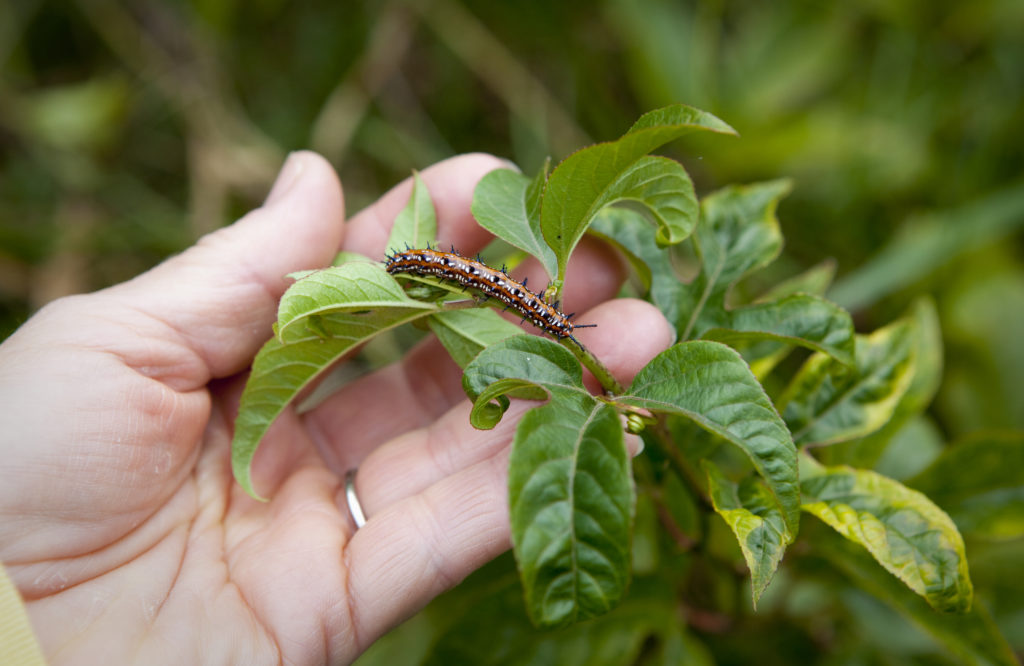 A variegated fritillary (Eutoieta Claudia) caterpillar is spotted munching on a passionflower plant (Passiflora). Since re-introducing native plants, the Jones have seen a dramatic increase in native caterpillars and butterflies. Because of this abundance, the first North American Butterfly Association survey was held on their land last summer.