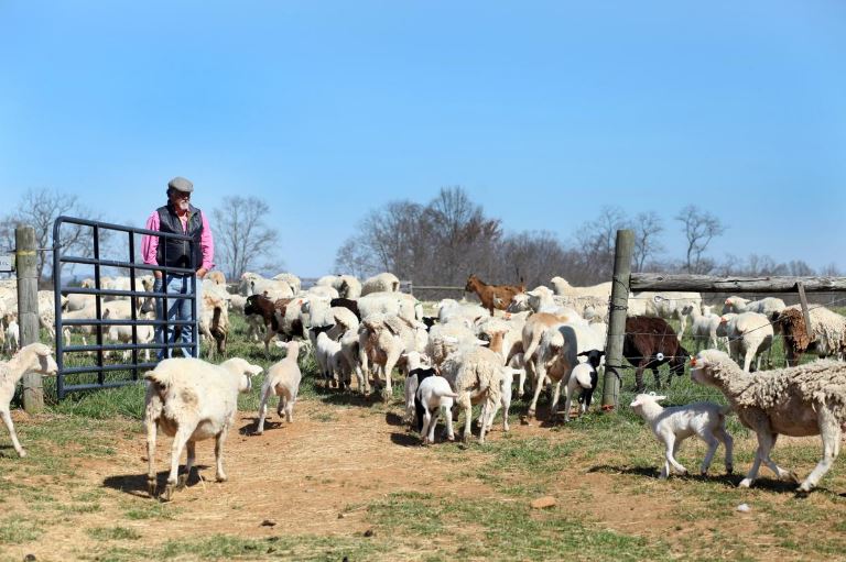 A large herd of fluffy, yet still intimidating, sheep run full speed through a gate as they’re rotated to an alternate pasture at Over Jordan Farm in Flint Hill, Va.
