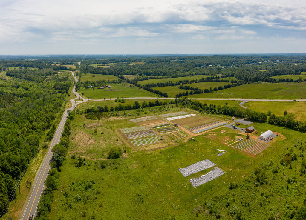Aerial shot of the Community Farm at Roundabout Meadows. Photo by Hugh Kenny