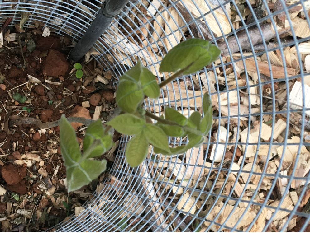 One of 50 hickory seedlings in plots D and E. Photo by Torney Van Acker