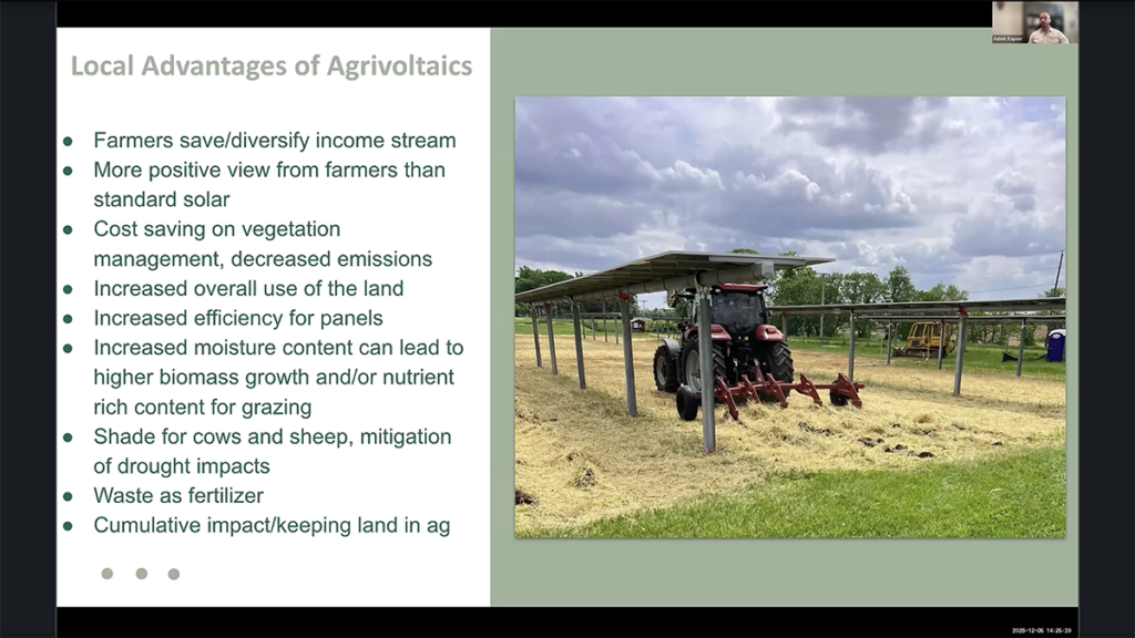 During the webinar, PEC Senior Energy & Climate Policy Advisor Ashish Kapoor and PEC Community Farm Manager Teddy Pitsiokos spoke about PEC’s PEC’s crop-based agrivoltaics project at the Community Farm at Roundabout Meadows. They reviewed the solar and agricultural setups, and how and why they chose those setups, with the goal of being able to replicate the project for farmers and others wanting to implement agrivoltaics in Virginia. In addition, the project serves as a demonstration site for people to interact with an agrivoltaics installation first-hand and learn about the many local advantages of small-scale agrivoltaics (see photo below).