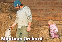 It’s pick-up day at Moutoux Orchard and it looks nothing like the scene at your nearest grocery store. It is mid-March when I went to visit, there is snow on the ground and members of the Moutoux year round whole-diet CSA are picking up their fresh veggies, milk, eggs, meat and fresh flour for this week’s meals. A buzz of activity — as adults pick out their food and the kids weave in and out of the barn playing.